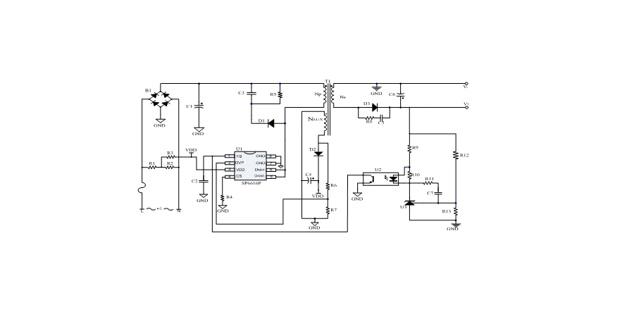 SP6616P是一顆電流模式PWM控制芯片,內(nèi)置650V高壓功率MOSFET,應(yīng)用于功率在13W以?xún)?nèi)的方案。SP6616P在PWM模式下工作于固定開(kāi)關(guān)頻率,這個(gè)頻率是由內(nèi)部精確設(shè)定。在空載或者輕載時(shí),工作頻率由IC內(nèi)部調(diào)整。芯片可以工作在綠色模式,以此來(lái)減小輕載時(shí)的損耗,提高整機(jī)的工作效率。SP6616P在啟動(dòng)和工作時(shí)只需要很小的電流,可以在啟動(dòng)電路中使用一個(gè)很大的電阻,以此來(lái)進(jìn)一步減小待機(jī)時(shí)的功耗。芯片內(nèi)置有斜坡補(bǔ)償電路,當(dāng)電路工作于大占空比時(shí),避免次諧波振蕩的發(fā)生,改善系統(tǒng)的穩(wěn)定性。內(nèi)置有前沿消隱時(shí)(Leading-edge blanking time),消除緩沖網(wǎng)絡(luò)中的二極管反向恢復(fù)電流對(duì)電路的影響。SP6616P采用了抖頻技術(shù),能夠有效改善系統(tǒng)的EMI性能。系統(tǒng)的跳頻頻率設(shè)置在音頻(20KHz)以上,在工作時(shí)可以避免系統(tǒng)產(chǎn)生噪音。SP6616P內(nèi)置多種保護(hù),包括輸出過(guò)壓保護(hù)(VOUT OVP),逐周期限流保護(hù)(OCP),過(guò)載保護(hù)(OLP),過(guò)壓保護(hù)(VDD OVP),VDD過(guò)壓箝位,欠壓保護(hù)(UVLO),過(guò)溫保護(hù)(OTP)等,通過(guò)內(nèi)部的圖騰柱驅(qū)動(dòng)結(jié)構(gòu)可以更好的改善系統(tǒng)的EMI特性和開(kāi)關(guān)的軟啟動(dòng)控制。