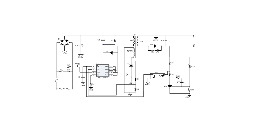 SP6616HF是一顆電流模式PWM控制芯片,內(nèi)置650V高壓功率MOSFET,應(yīng)用于功率在12W以內(nèi)的方案。SP6616HF在PWM模式下工作于固定開(kāi)關(guān)頻率,這個(gè)頻率是由內(nèi)部精確設(shè)定。在空載或者輕載時(shí),工作頻率由IC內(nèi)部調(diào)整。芯片可以工作在綠色模式,以此來(lái)減小輕載時(shí)的損耗,提高整機(jī)的工作效率。SP6616HF在啟動(dòng)和工作時(shí)只需要很小的電流,可以在啟動(dòng)電路中使用一個(gè)很大的電阻,以此來(lái)進(jìn)一步減小待機(jī)時(shí)的功耗。芯片內(nèi)置有斜坡補(bǔ)償電路,當(dāng)電路工作于大占空比時(shí),避免次諧波振蕩的發(fā)生,改善系統(tǒng)的穩(wěn)定性。內(nèi)置有前沿消隱時(shí)(Leading-edge blanking time),消除緩沖網(wǎng)絡(luò)中的二極管反向恢復(fù)電流對(duì)電路的影響。SP6616HF采用了抖頻技術(shù),能夠有效改善系統(tǒng)的EMI性能。系統(tǒng)的跳頻頻率設(shè)置在音頻(20KHz)以上,在工作時(shí)可以避免系統(tǒng)產(chǎn)生噪音。SP6616HF內(nèi)置多種保護(hù),包括輸出過(guò)壓保護(hù)(VOUT OVP),逐周期限流保護(hù)(OCP),過(guò)載保護(hù)(OLP),過(guò)壓保護(hù)(VDD OVP),VDD過(guò)壓箝位,欠壓保護(hù)(UVLO),過(guò)溫保護(hù)(OTP)等,通過(guò)內(nèi)部的圖騰柱驅(qū)動(dòng)結(jié)構(gòu)可以更好的改善系統(tǒng)的EMI特性和開(kāi)關(guān)的軟啟動(dòng)控制