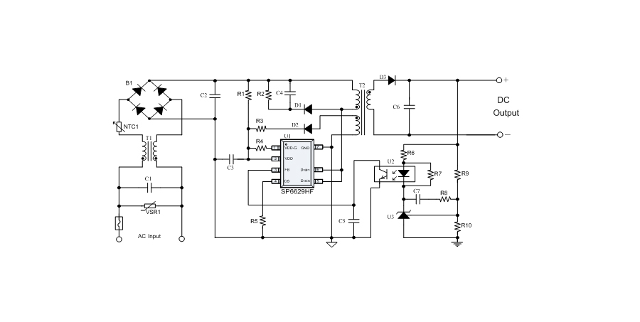 SP6629HF在PWM模式下工作于固定頻率,這個頻率是由內(nèi)部精確設(shè)定的。在空載或者輕載時,工作頻率由IC內(nèi)部調(diào)整。芯片可以工作在綠色模式,以此來減小輕載時的損耗,提高整機的工作效率,SP6629HF在啟動和工作時只需要很小的電流,可以在啟動電路中使用一個很大的電阻,以此來進一步減小待機時的功耗。芯片內(nèi)置有斜坡補償電路,當(dāng)電路工作于大占空比時,避免次諧波振蕩的發(fā)生,改善系統(tǒng)的穩(wěn)定性。內(nèi)置有前沿消隱時(Leading-edge blanking time),消除緩沖網(wǎng)絡(luò)中的二極管反向恢復(fù)電流對電路的影響。SP6629HF采用了抖頻技術(shù),能夠有效改善系統(tǒng)的EMI性能。系統(tǒng)的跳頻頻率設(shè)置在音頻(20KHz)以上,在工作時可以避免系統(tǒng)產(chǎn)生噪音。SP6629HF內(nèi)置多種保護,包括逐周期限流保護(OCP),過載保護(OLP),過壓保護(OVP),VDD過壓箝位,欠壓保護(UVLO),過溫保護(OTP)等,通過內(nèi)部的圖騰柱驅(qū)動結(jié)構(gòu)可以更好的改善系統(tǒng)的EMI特性和開關(guān)的軟啟動控制。SP6629HF使用SOP7無鉛封裝。