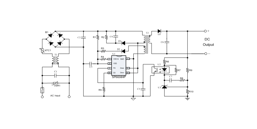 SP6636HP是一顆電流模式PWM控制芯片,內(nèi)置功率MOSFET,用于功率在12W以內(nèi)的方案。該芯片在系統(tǒng)輸出空載時工作在跳頻模式,在系統(tǒng)輸出輕載到中等負(fù)載階段工作在PFM模式,在輸出重載時工作在最大恒定工作頻率。SP6636HP的啟動電流和工作電流設(shè)定的比較小,以此減小待機時的功耗。芯片內(nèi)置有斜坡補償電路,避免次諧波振蕩的發(fā)生,改善系統(tǒng)的穩(wěn)定性。芯片內(nèi)置有前沿消隱時間(Leading-edge blanking time),消除緩沖網(wǎng)絡(luò)中的二極管反向恢復(fù)電流對電路的影響。該芯片帶有抖頻功能,能夠有效改善系統(tǒng)的EMI性能。芯片最低的工作頻率設(shè)置在音頻以上,在工作時可以避免系統(tǒng)產(chǎn)生噪音。SP6636HP內(nèi)置多種保護,包括逐周期限流保護(OCP),過壓保護(OVP),VDD過壓箝位,欠壓保護(UVLO),過溫保護(OTP)等,通過內(nèi)部的圖騰柱驅(qū)動結(jié)構(gòu)可以更好的改善系統(tǒng)的EMI特性和開關(guān)的軟啟動控制。