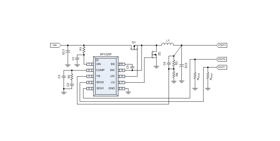 SP1220F是一款同步降壓型PWM控制器,該控制器可驅(qū)動(dòng)雙路輸出8A(4A+4A)負(fù)載電流。設(shè)計(jì)允許SP1220F在9V到40V寬輸入電壓范圍內(nèi)工作。通過(guò)將COMP/EN引腳邏輯電平拉低來(lái)實(shí)現(xiàn)外部關(guān)斷功能,并進(jìn)入待機(jī)模式。外部補(bǔ)償使反饋控制環(huán)路具有良好的線壓調(diào)整率和負(fù)載調(diào)整率,且外圍設(shè)計(jì)靈活。