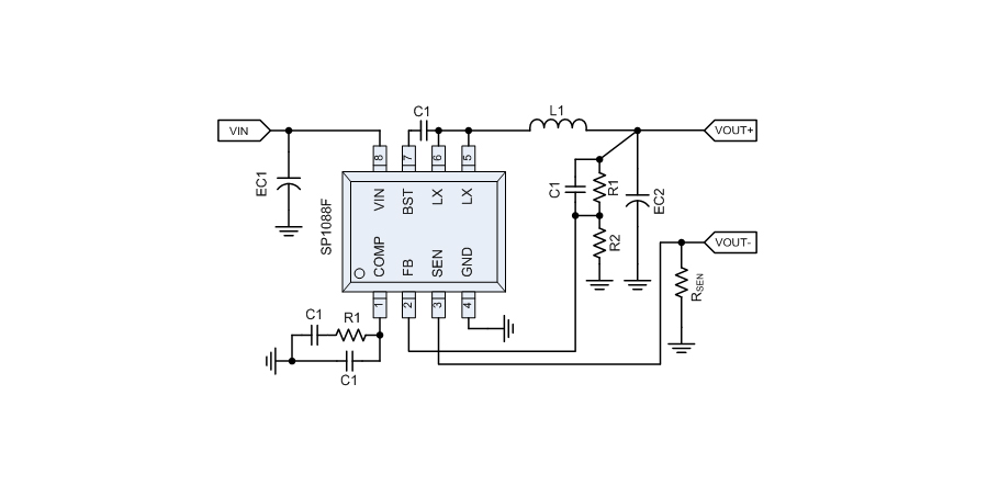 SP1088F是一款同步降壓轉(zhuǎn)換器,該轉(zhuǎn)換器可驅(qū)動(dòng)輸出2.4A負(fù)載電流。設(shè)計(jì)允許SP1088F在9V到40V寬輸入電壓范圍內(nèi)工作。通過將COMP/EN引腳邏輯電平拉低來實(shí)現(xiàn)外部關(guān)斷功能,并進(jìn)入待機(jī)模式。外部補(bǔ)償使反饋控制環(huán)路具有良好的線壓調(diào)整率和負(fù)載調(diào)整率,且外圍設(shè)計(jì)靈活。