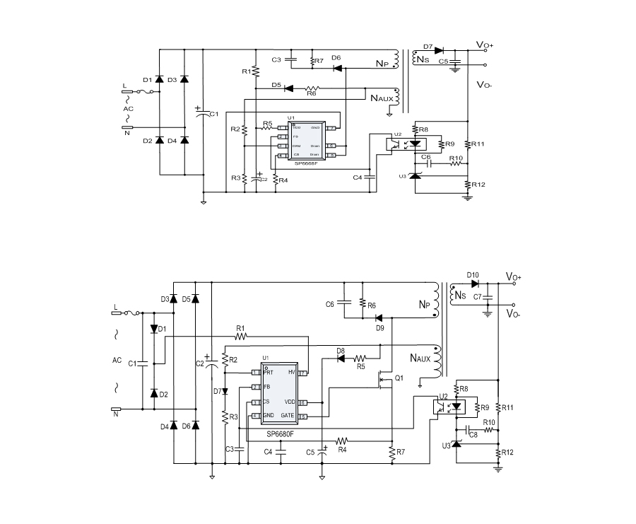 SP6668F內(nèi)置多種保護(hù),包括:輸入電壓過低保護(hù)(Brown-out),輸入電壓過高保護(hù)(Line-ovp),輸出電壓過壓保護(hù)(VO_OVP),輸出二極管短路保護(hù),逐周期過流保護(hù)(OCP),過載保護(hù)(OLP),VDD過壓保護(hù)(OVP),VDD欠壓保護(hù)(UVLO),過溫保護(hù)(OTP)等。