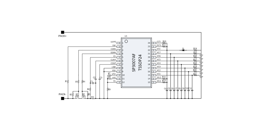 SP3007AF是一款用于6-7串鋰電池的保護(hù)芯片,SP3007AF 內(nèi)部集成了高精度的電壓、電流檢測(cè)電路,能夠?qū)崿F(xiàn)每串電池的過(guò)壓、欠壓保護(hù),以及整串電池的充電過(guò)流、放電過(guò)流、短路保護(hù)和充放電的溫度保護(hù)等。SP3007AF 內(nèi)部集成 N型 MOSFET 的驅(qū)動(dòng)電路,能夠直接驅(qū)動(dòng)外部 N 型充電管和放電管,既可以兼容充放電分口應(yīng)用,也可以兼容充放電同口應(yīng)用。