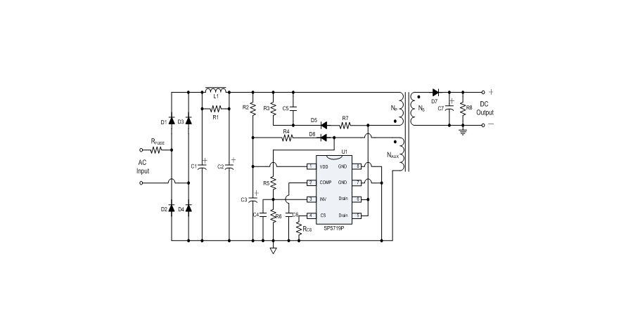 SP5719P是一顆高精度離線式開關電源電路,應用于低功耗AC/DC充電器與適配器。SP5719P使用原邊取樣來進行精確的恒流、恒壓控制,可以省去一般應用中的光耦與TL431。