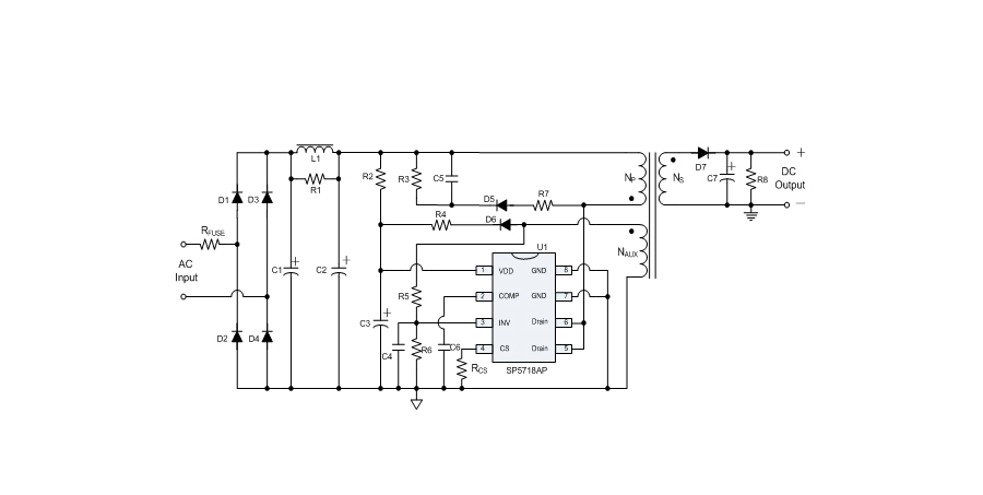 SP5718AP是一顆高精度離線式開關(guān)電源電路,應(yīng)用于低功耗AC/DC充電器與適配器。SP5718AP使用原邊取樣來進行精確的恒流、恒壓控制,可以省去一般應(yīng)用中的光耦與TL431。