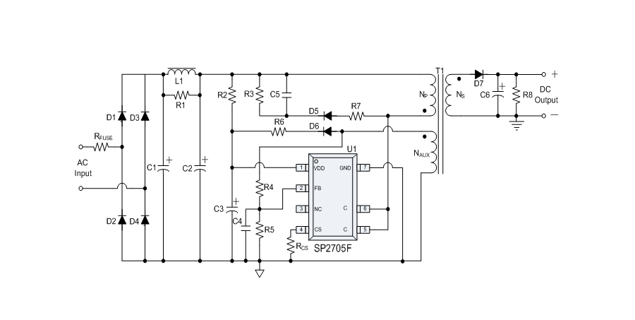 SP2705F非常適合低成本應(yīng)用方案,內(nèi)置環(huán)路補償,無需外置補償電容;采用原邊反饋控制,無需光耦和TL431。