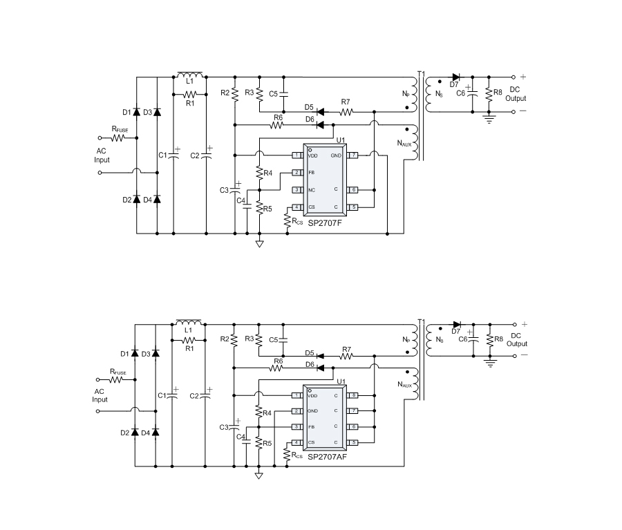 SP2707F非常適合低成本應(yīng)用方案,內(nèi)置環(huán)路補償,無需外置補償電容;采用原邊反饋控制,無需光耦和TL431。
