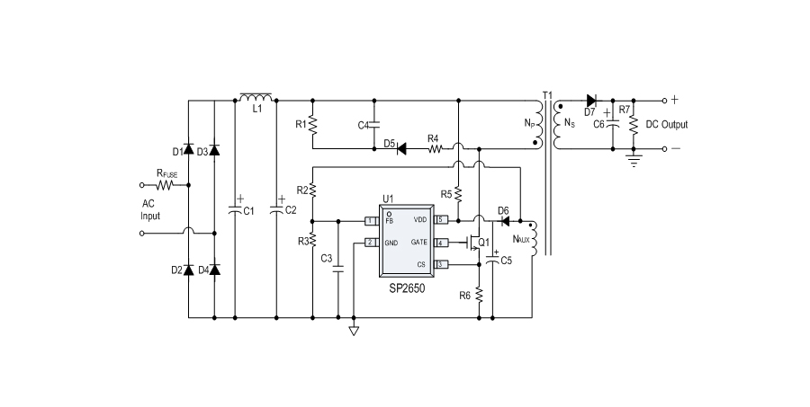 SP2650是一款性能優(yōu)異的原邊反饋控制電路,應(yīng)用于小功率AC/DC充電器與適配器??刂齐娐肥褂迷叢蓸蛹夹g(shù)進(jìn)行精確的恒流、恒壓控制,可以省去一般應(yīng)用中的光耦與TL431。