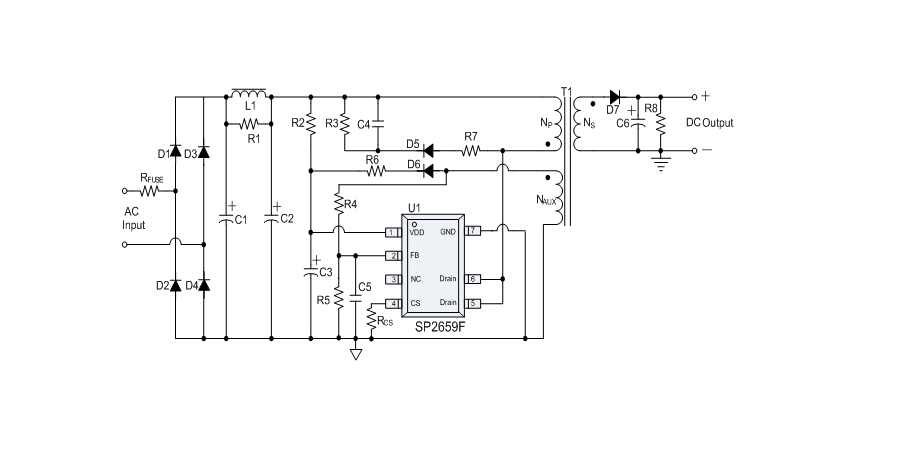 SP2659F是一款性能優(yōu)異的原邊反饋控制電路,應(yīng)用于小功率AC/DC充電器與適配器??刂齐娐肥褂迷叢蓸蛹夹g(shù)進行精確的恒流、恒壓控制,可以省去一般應(yīng)用中的光耦與TL431。